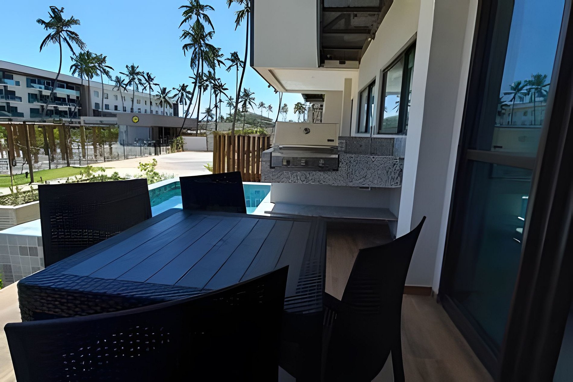 Desfrute de momentos relaxantes na ampla varanda com a piscina privativa, churrasqueira, espaço equipado com cadeiras e uma mesa, enquanto contempla a vista deslumbrante do complexo do Ipioca Beach e sua praia.